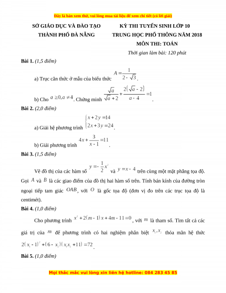 Đề chính thức Toán vào 10 TP Đà Nẵng năm 2018 - 2019