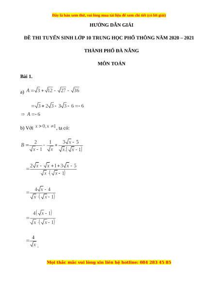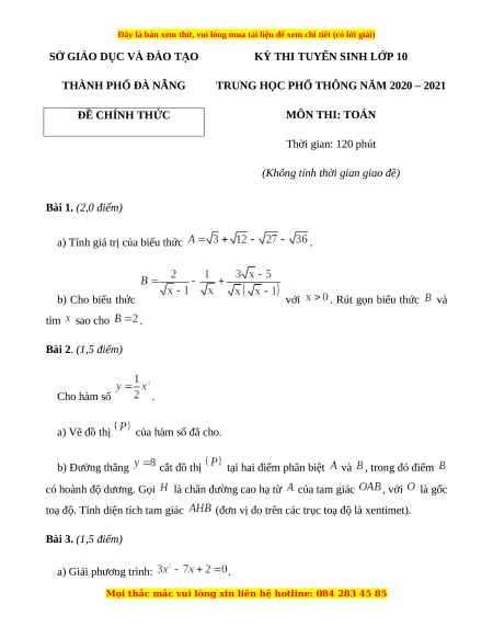 Đề chính thức Toán vào 10 TP Đà Nẵng năm 2020 - 2021