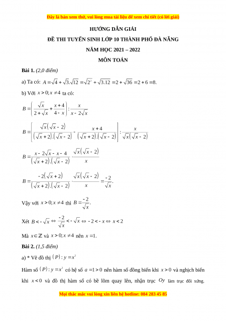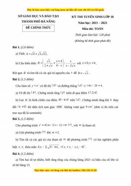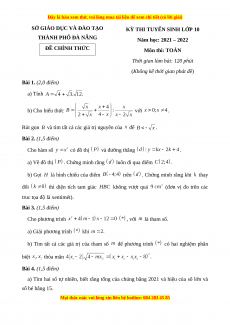 Đề chính thức Toán vào 10 TP Đà Nẵng năm 2021 - 2022