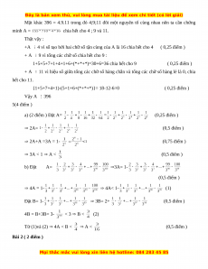{1+5+7+4+1)-(5+1+6+(*+*+*)}= 18-12-6=0 ( 0,25 điểm ) Vậy A 396 5(4 điểm ) a) (2 điểm ) Đặt A= (0,25 điểm ) 2A= (0,5 điểm ) 2A+A =3A = 1- (0,75 điểm ) 3A < 1 A < (0,5 điểm ) b) Đặt A= 3A= 1- (0,5 điểm ) 4A = 1- 4A< 1- (1) Đặt B= 1- 3B= 2+ (0,5 điểm ) 4B = B+3B= 3- < 3 B < (2)