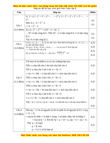 Đáp án đề thi học sinh giỏi môn Toán lớp 6 Câu Đáp án Điểm