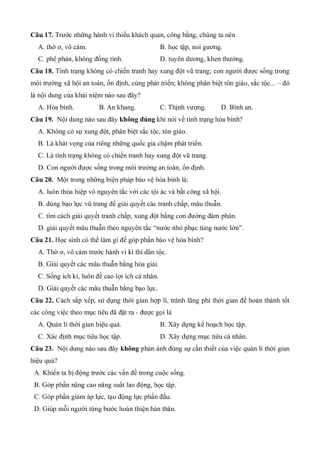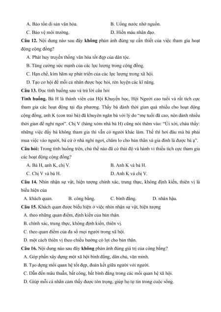 Câu 14. Nhìn nhận sự vật, hiện tượng chính xác, trung thực, không định kiến, thiên vị là biểu hiện của A. khách quan. B. công bằng. C. bình đẳng. D. nhân hậu.