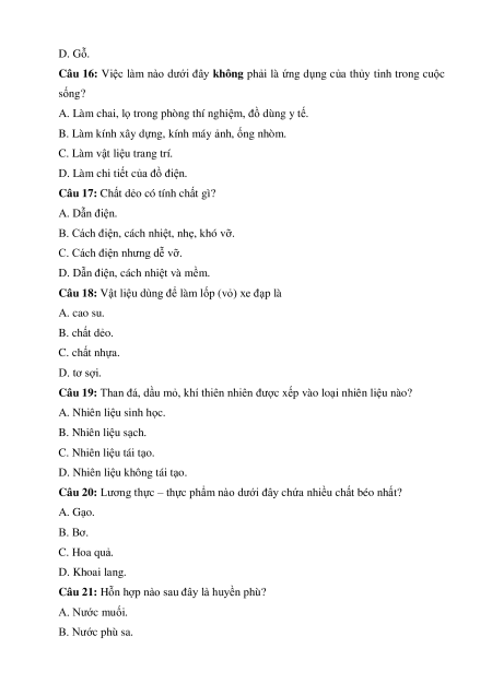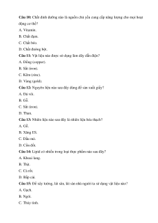 Câu 15: Để xây tường, lát sân, lát sàn nhà người ta sử dụng vật liệu nào? A. Gạch. B. Ngói. C. Thủy tinh.