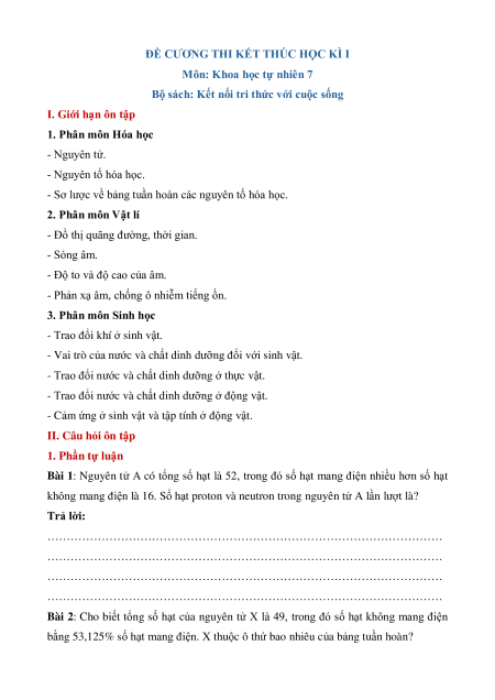 Đề cương Cuối kì 1 KHTN 7 Kết nối tri thức có đáp án