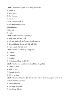 Câu 4: Chất nào sau đây tan nhiều trong nước nóng? A. Đường ăn. B. Khí oxygen. C. Khí nitrogen. D. Đá vôi.