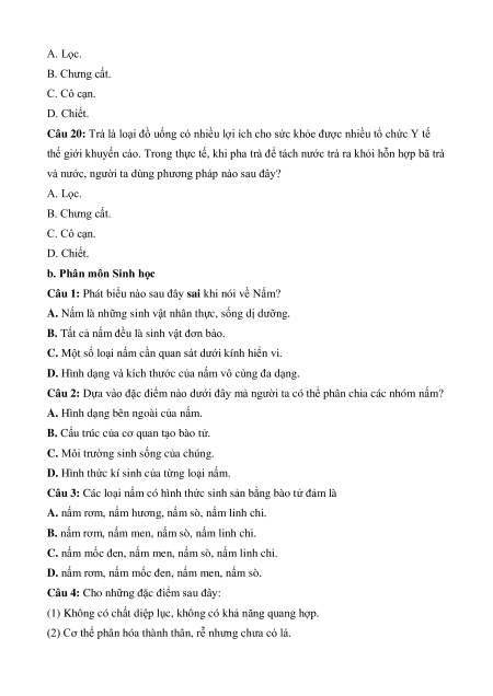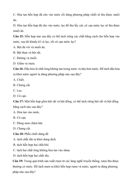 Câu 12: Phương pháp nào sau đây dùng để tách chất rắn không tan ra khỏi hỗn hợp lỏng? A. Chiết. B. Cô cạn. C. Lọc.