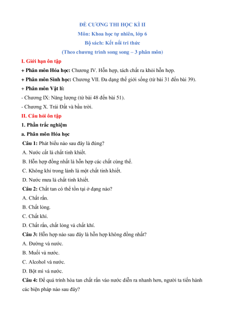 Đề cương Cuối kì 2 KHTN 6 Kết nối tri thức (song song)