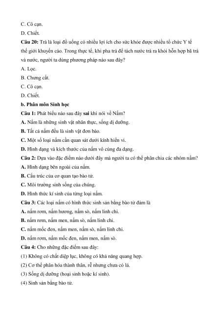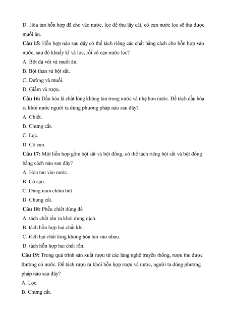 Câu 12: Phương pháp nào sau đây dùng để tách chất rắn không tan ra khỏi hỗn hợp lỏng? A. Chiết. B. Cô cạn. C. Lọc.