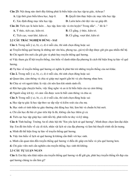 Câu 22: Tự giác là...làm việc, học tập, không cần ai nhắc nhở, giám sát, không do áp lực bên ngoài. Trong dấu “…” đó là ? A. Chủ động. B. Tự ý thức. C. Tự nhận thức. D. Tích cực.