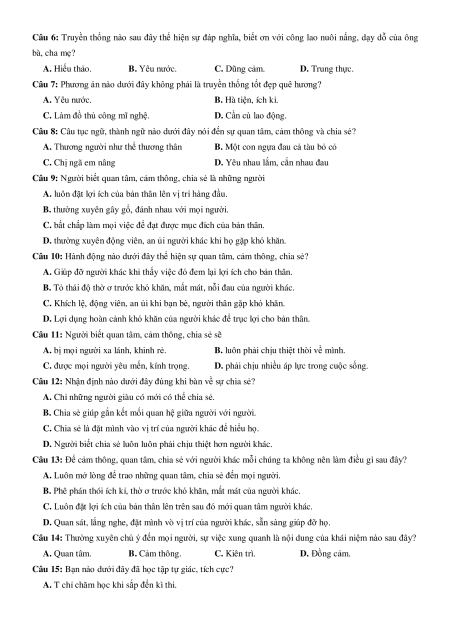 Câu 14: Thường xuyên chú ý đến mọi người, sự việc xung quanh là nội dung của khái niệm nào sau đây? A. Quan tâm.