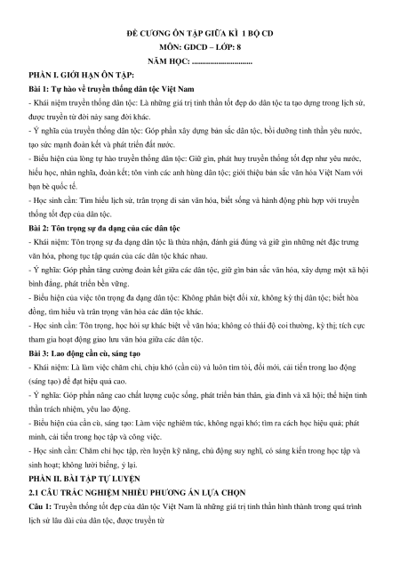 - Tailieugiaovien.com.vn giới thiệu bộ đề cương Giữa kì 1 Giáo dục công dân 8 Cánh diều gồm kiến thức cần ôn tập, câu hỏi trắc nghiệm nhiều phương án lựa chọn & đúng sai và câu hỏi tự luận cùng đề thi có lời giải chi tiết mới nhất nhằm giúp Giáo viên có thêm tài liệu tham khảo ra đề thi GDCD 8.