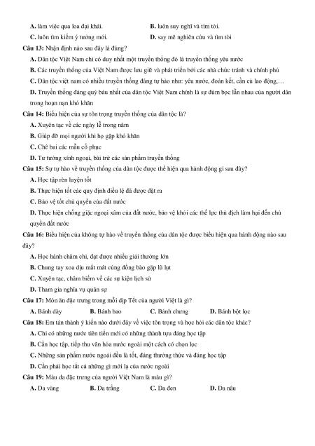 Câu 19: Màu da đặc trưng của người Việt Nam là màu gì? A. Da vàng B. Da trắng C. Da đen D. Da nâu