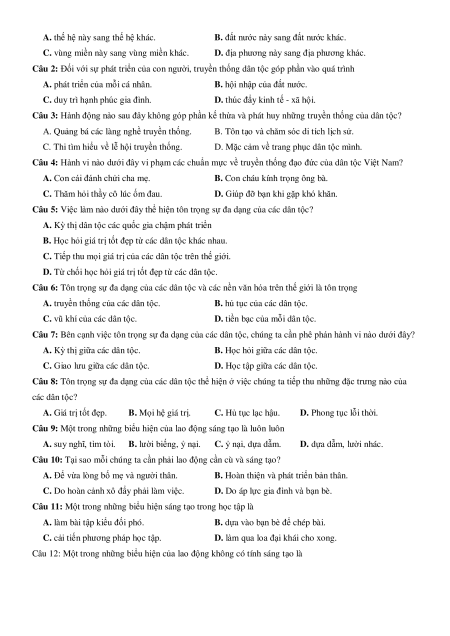 Câu 6: Tôn trọng sự đa dạng của các dân tộc và các nền văn hóa trên thế giới là tôn trọng