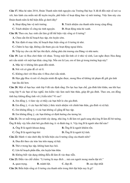 Câu 22: Hành vi nào dưới đây là biểu hiện của lí tưởng sống của thanh niên?