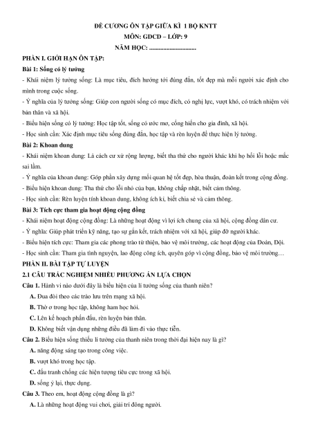 Đề cương Giữa kì 1 GDCD 9 Kết nối tri thức (có lời giải)