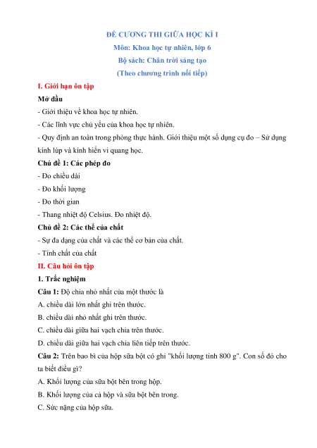 Đề cương Giữa kì 1 KHTN 6 Chân trời sáng tạo (nối tiếp)