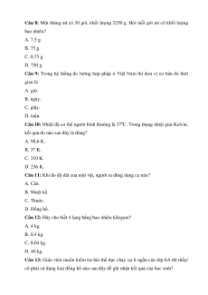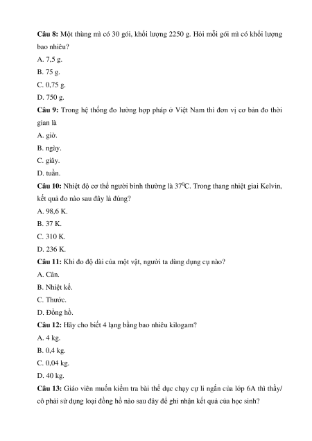 Câu 8: Một thùng mì có 30 gói, khối lượng 2250 g. Hỏi mỗi gói mì có khối lượng bao nhiêu? A. 7,5 g. B. 75 g. C. 0,75 g. D. 750 g.
