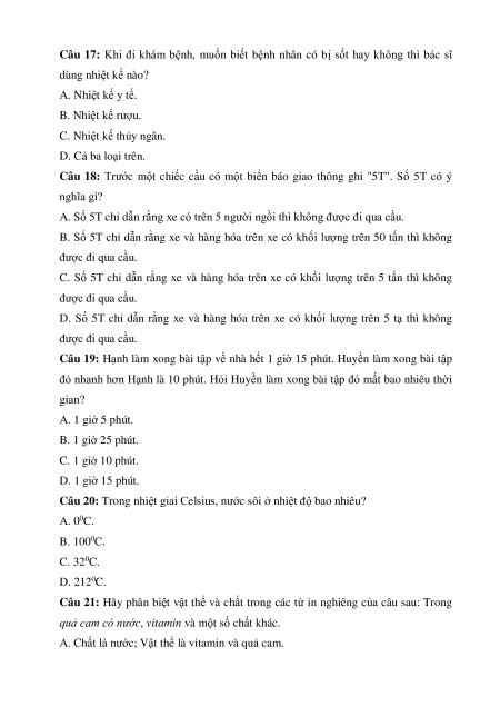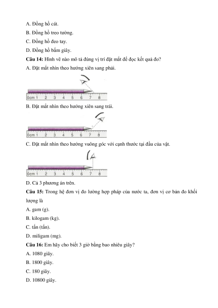 Câu 16: Em hãy cho biết 3 giờ bằng bao nhiêu giây? A. 1080 giây. B. 1800 giây. C. 180 giây. D. 10800 giây.