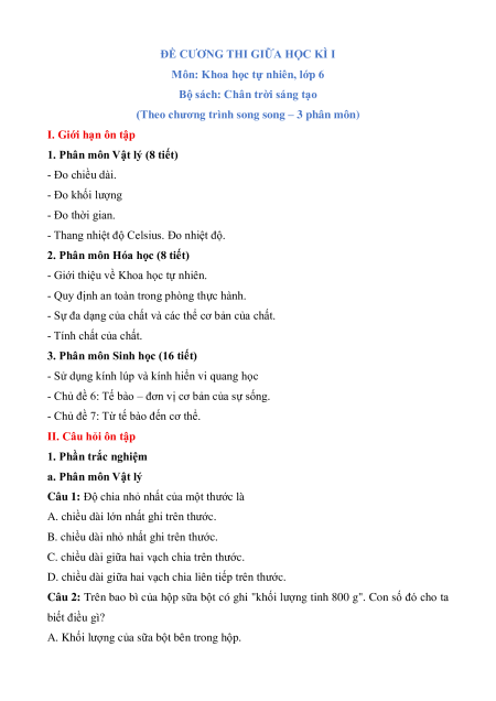 Đề cương Giữa kì 1 KHTN 6 Chân trời sáng tạo (song song)