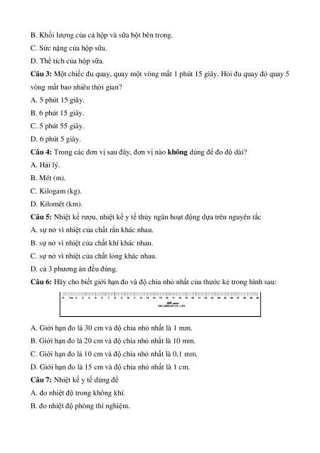 Câu 4: Trong các đơn vị sau đây, đơn vị nào không dùng để đo độ dài? A. Hải lý. B. Mét (m). C. Kilogam (kg). D. Kilomét (km).