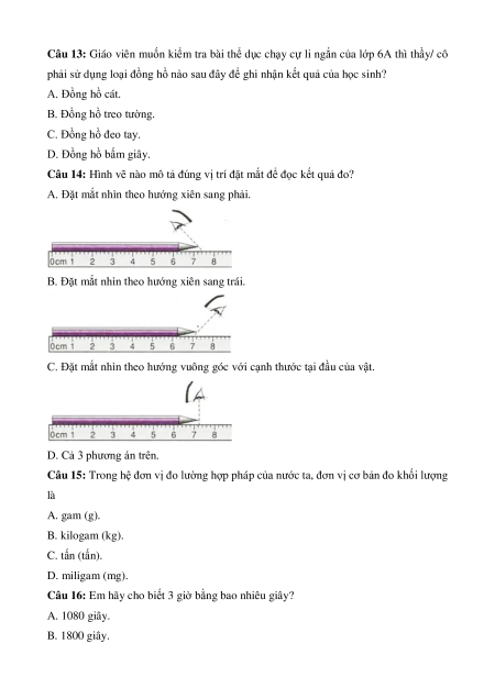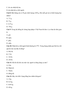 Câu 9: Trong hệ thống đo lường hợp pháp ở Việt Nam thì đơn vị cơ bản đo thời gian là A. giờ. B. ngày. C. giây. D. tuần.