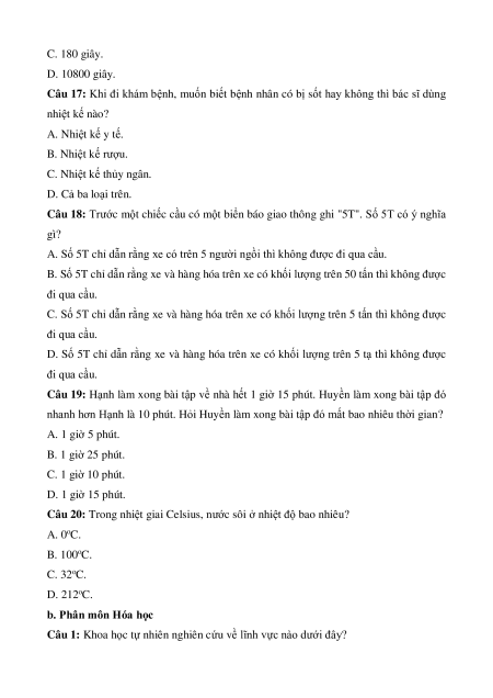 Câu 16: Em hãy cho biết 3 giờ bằng bao nhiêu giây? A. 1080 giây. B. 1800 giây.
