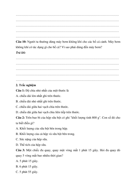 Câu 10: Người ta thường dùng máy bơm không khí cho các bể cá cảnh. Máy bơm