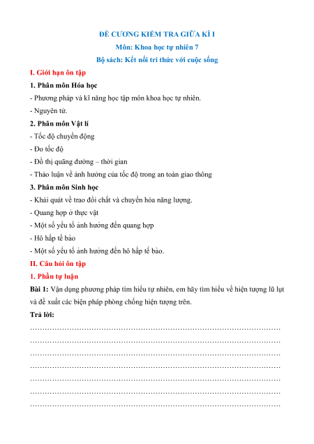 Đề cương Giữa kì 1 KHTN 7 Kết nối tri thức có đáp án