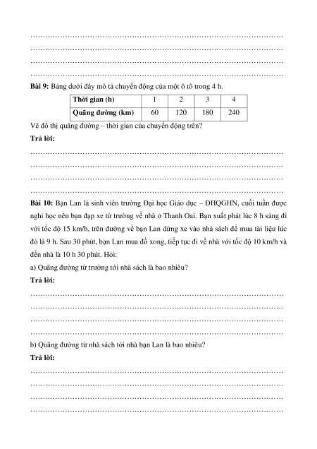 Bài 9: Bảng dưới đây mô tả chuyển động của một ô tô trong 4 h. Thời gian (h) 1 2 3 4 Quãng đường (km) 60 120 180 240