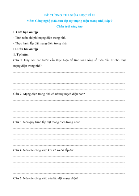 Đề cương Giữa kì 2 Công nghệ 9 Chân trời sáng tạo Lắp đặt mạng điện trong nhà