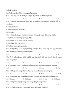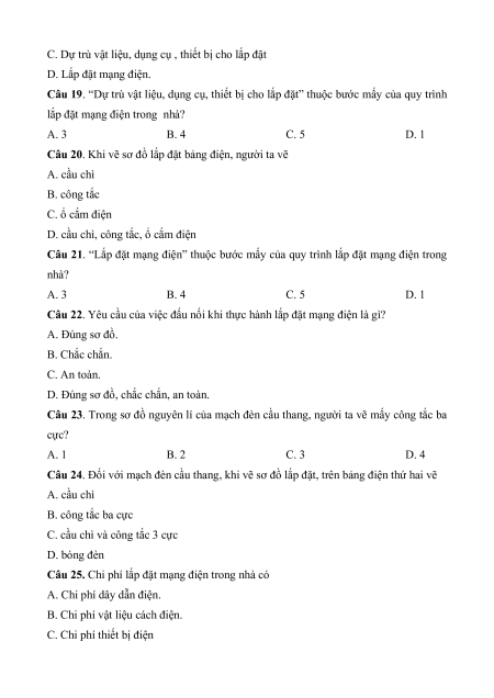 Câu 9. Quy trình lắp đặt mạng điện trong nhà gồm mấy bước? A. 4 B. 5 C. 6 D. 3