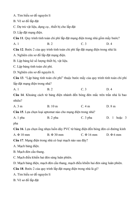 Câu 11. Quy trình tính toán chi phí lắp đặt mạng điện trong nhà gốm mấy bước? A. 1 B. 2 C. 3 D. 4