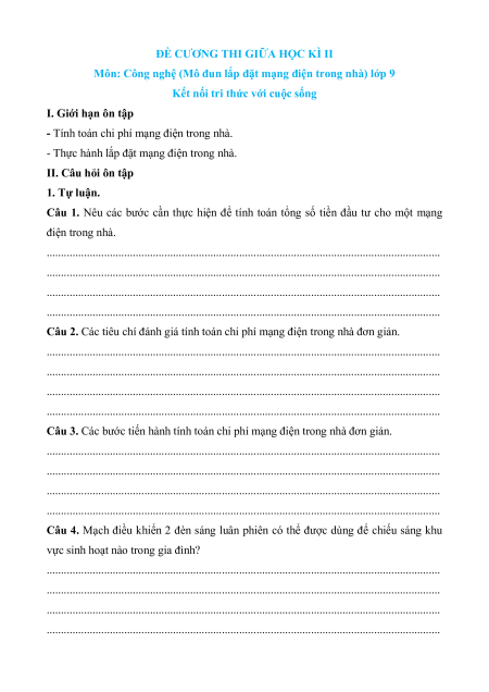 Đề cương Giữa kì 2 Công nghệ 9 Kết nối tri thức Lắp đặt mạng điện trong nhà