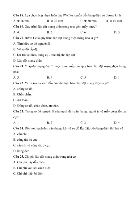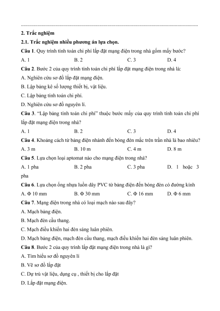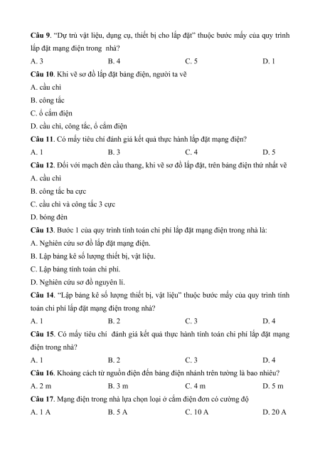 Câu 1. Quy trình tính toán chi phí lắp đặt mạng điện trong nhà gốm mấy bước? A. 1 B. 2 C. 3 D. 4