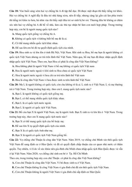 Câu 22: Vợ chồng chú Thuận là công dân Việt Nam. Năm 2019, vợ chồng chú Minh xin thôi quốc tịch