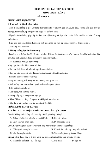 D. Chịu đựng hành vi bạo lực học đường của những bạn kia. 2.2 PHẦN TỰ LUẬN