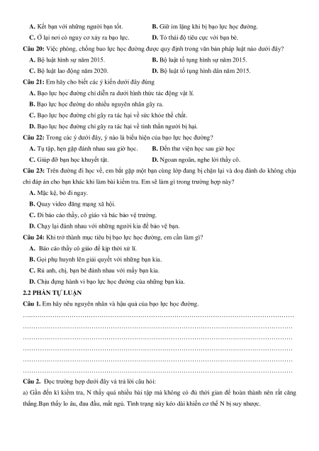 D. Chịu đựng hành vi bạo lực học đường của những bạn kia. 2.2 PHẦN TỰ LUẬN