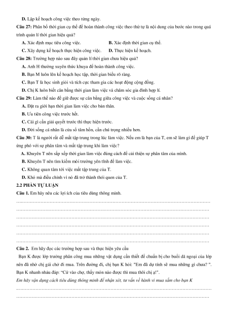 Câu 26: Việc làm nào sau đây thể hiện quản lí thời gian chưa hiệu quả?