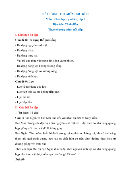 Đề cương Giữa kì 2 KHTN 6 Cánh diều (nối tiếp)