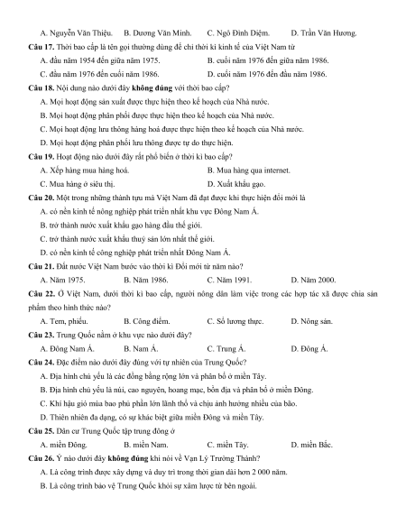 Câu 17. Thời bao cấp là tên gọi thường dùng để chỉ thời kì kinh tế của Việt Nam từ