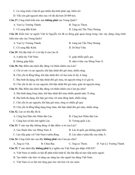 Câu 27. Công trình kiến trúc nào không phải của Trung Quốc? A. Vạn Lý Trường Thành. B. Ăng-co Thom. C. Cố cung Bắc Kinh.