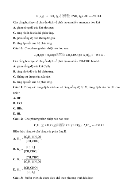 Biểu thức hằng số cân bằng của phản ứng là [C H ].[H O] A. 2 2 2 K . C [CH CHO] 3 [C H ] B. 2 2 K . C [CH CHO] 3 [CH CHO] C. 3 K . C [C H ].[H O] 2 2 2 [CH CHO] D. 3 K . C [C H ] 2 2