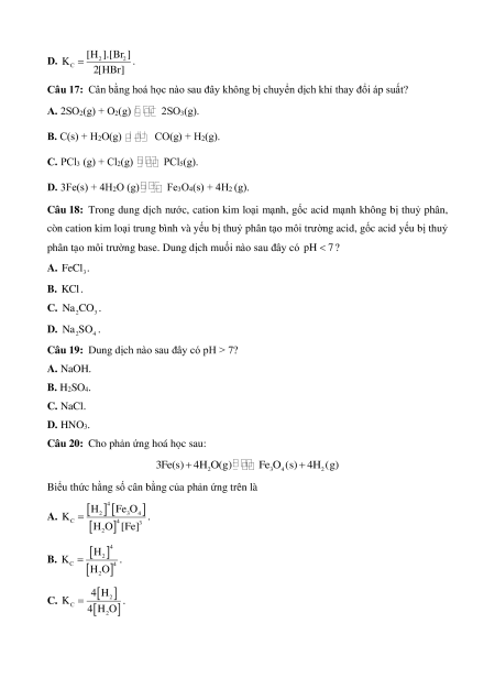 Biểu thức hằng số cân bằng (Kc) của phản ứng trên là A. 2[HBr] K . C [Br ].[H ] 2 2 2 B. [HBr] K . C [Br ].[H ] 2 2 C. [H ].[Br ] 2 2 K . C 2 [HBr]