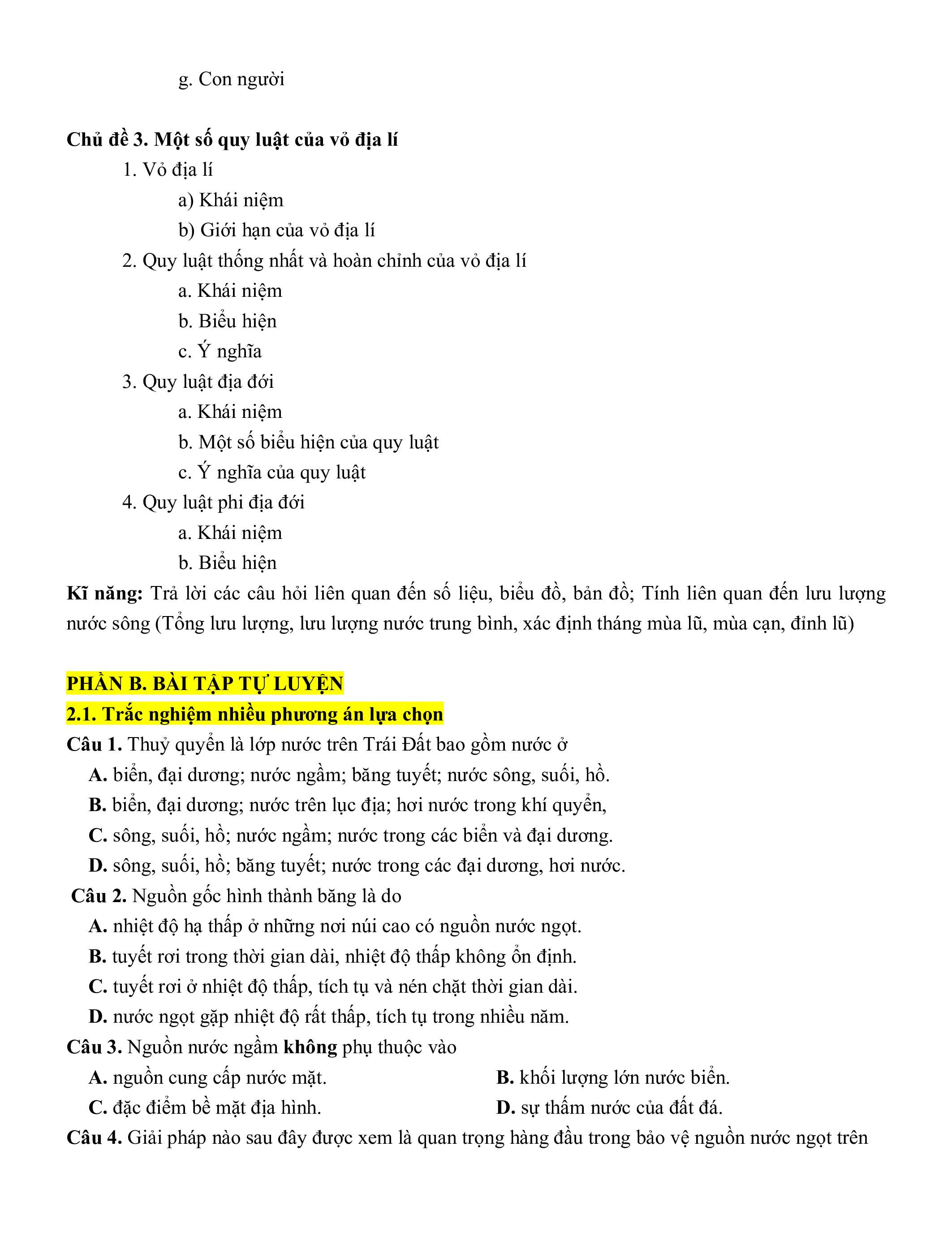 Câu 1. Thuỷ quyển là lớp nước trên Trái Đất bao gồm nước ở