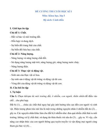 - Tailieugiaovien.com.vn giới thiệu bộ đề cương cuối kì 1 Khoa học lớp 5 Cánh diều mới nhất nhằm giúp Giáo viên có thêm tài liệu tham khảo ra đề thi Khoa học lớp 5.