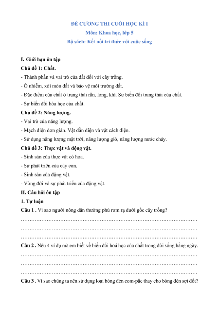 Đề cương ôn tập cuối học kì 1 Khoa học lớp 5 Kết nối tri thức