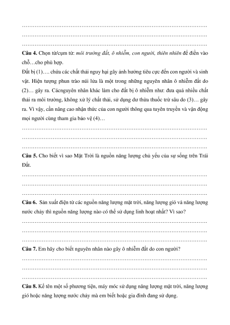 Câu 4. Chọn từ/cụm từ: môi trường đất, ô nhiễm, con người, thiên nhiên để điền vào chỗ…cho phù hợp.
