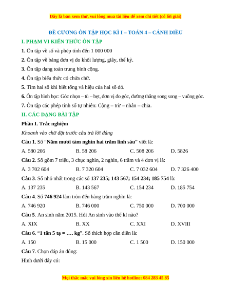 ĐỀ CƯƠNG ÔN TẬP HỌC KÌ I – TOÁN 4 – CÁNH DIỀU