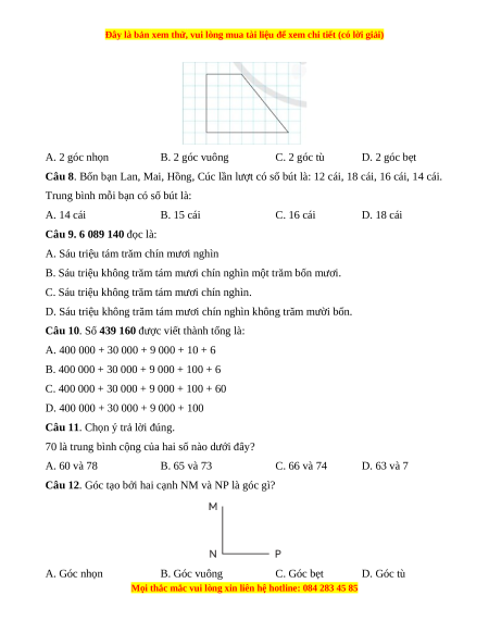 Câu 8. Bốn bạn Lan, Mai, Hồng, Cúc lần lượt có số bút là: 12 cái, 18 cái, 16 cái, 14 cái.