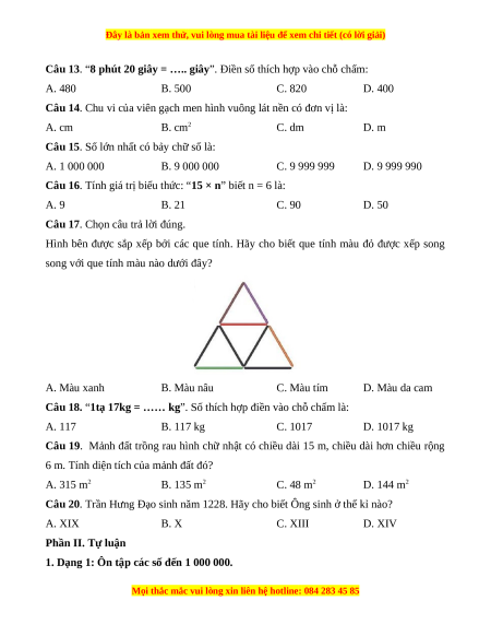 Câu 20. Trần Hưng Đạo sinh năm 1228. Hãy cho biết Ông sinh ở thế kỉ nào? A. XIX B. X C. XIII D. XIV Phần II. Tự luận